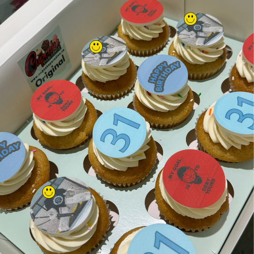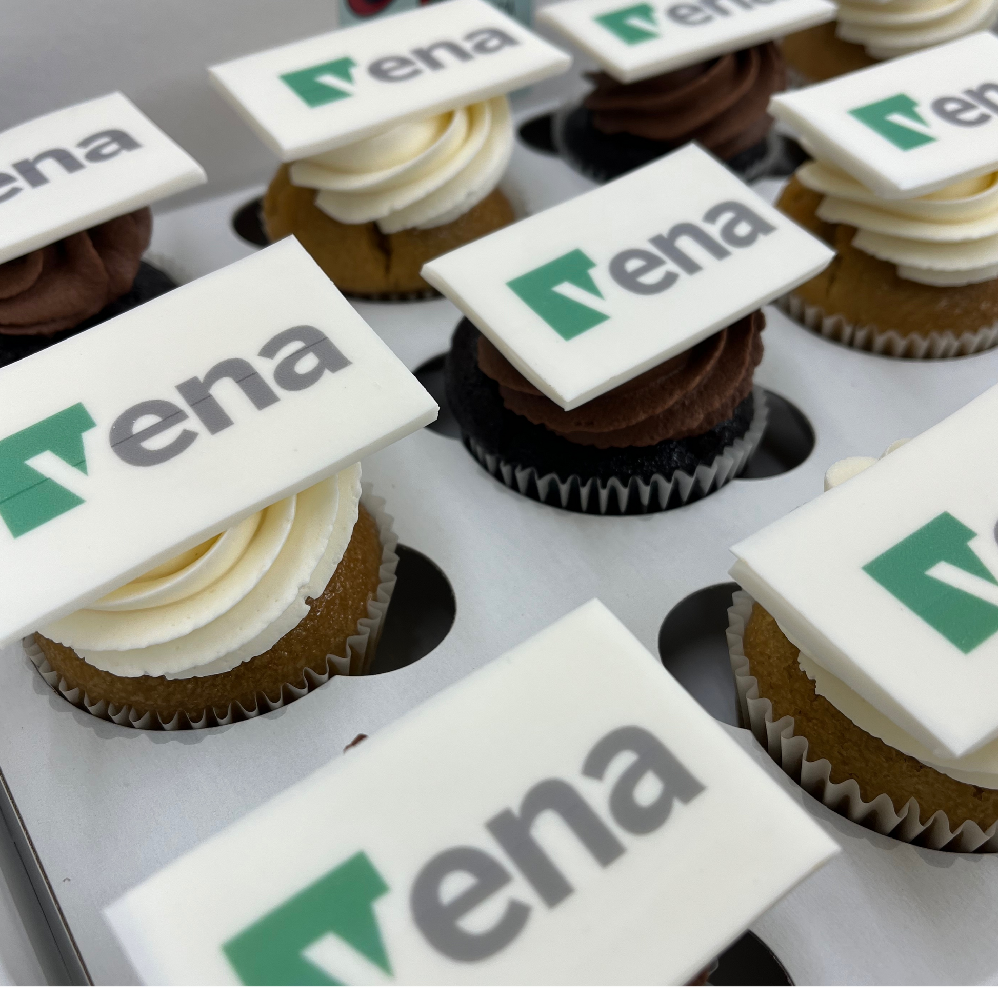 Decadent moist Vanilla and Chocolate cupcakes topped with delicious Vanilla and Chocolate frosting. These Custom Logo Cupcakes are amazing for your next party, celebration, birthday and everything happy. Order online!